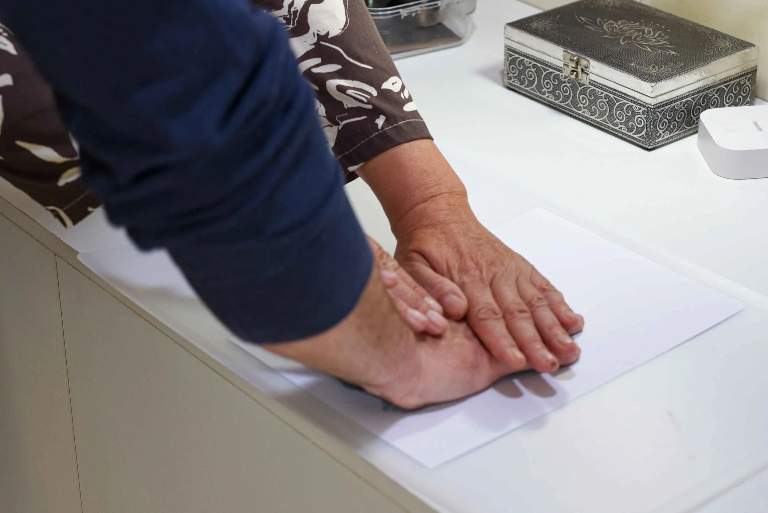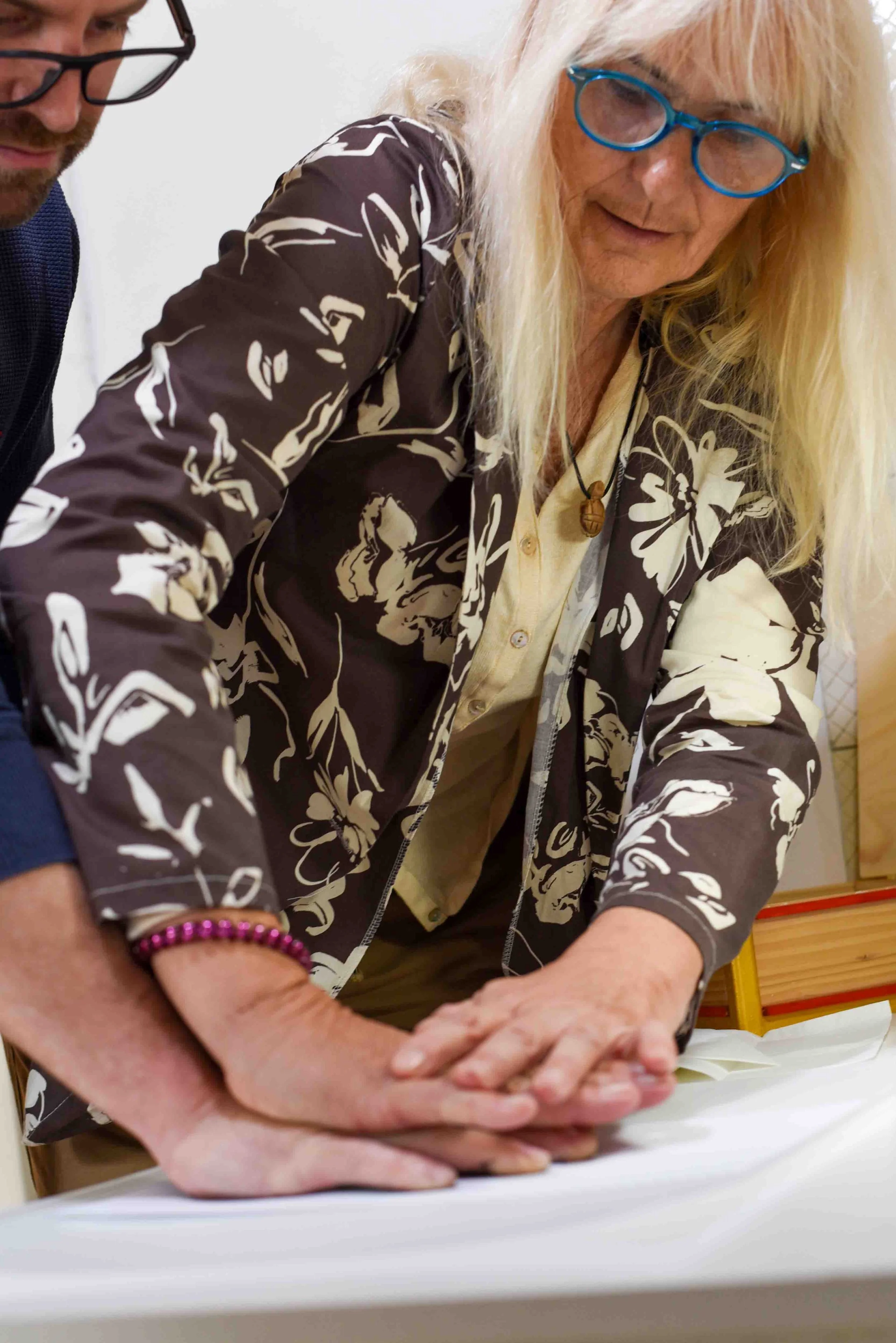 Nun folgt der Handabdruck, der sehr gleichmässig sein muss. Trotzdem wird es Lücken geben – von denen erfahren wir eine Menge!